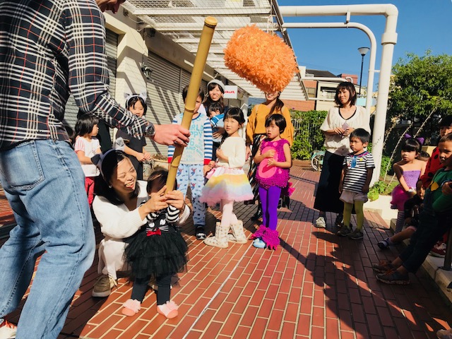 メキシコや他の中南米の国が発祥で、紙製で、中にお菓子やおもちゃなどを詰めているので、棒でピニャータを叩いて、中から出てくるお菓子をみんなで取り合います。