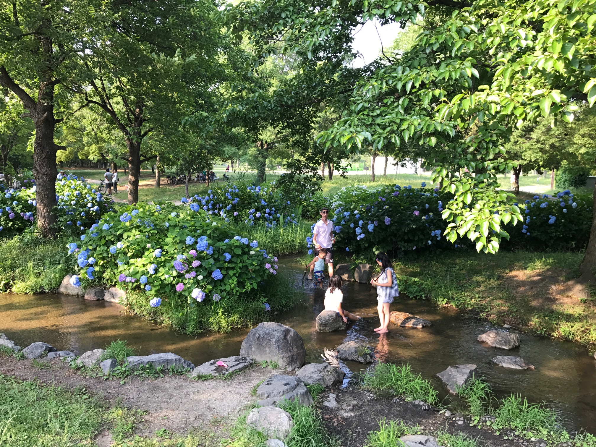 場所: 鶴見緑地公園 (鶴見緑地公園内のキャンプ場の前にある小川エリア。下の地図の赤いマーク)