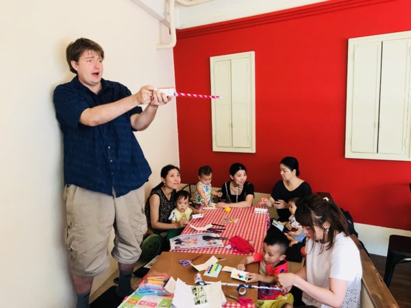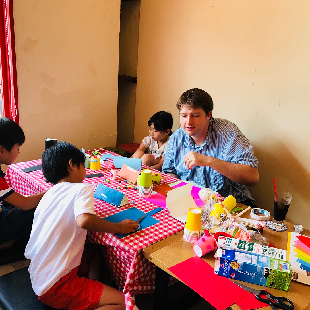 DIY工房『Osaka Maker Space』を運営する、アメリカ出身の陽気で明るいDIYマスター“ライアン先生”が親子カフェにやってきて、キッズ&ママが一緒に英語でワイワイおもちゃを作ります♪