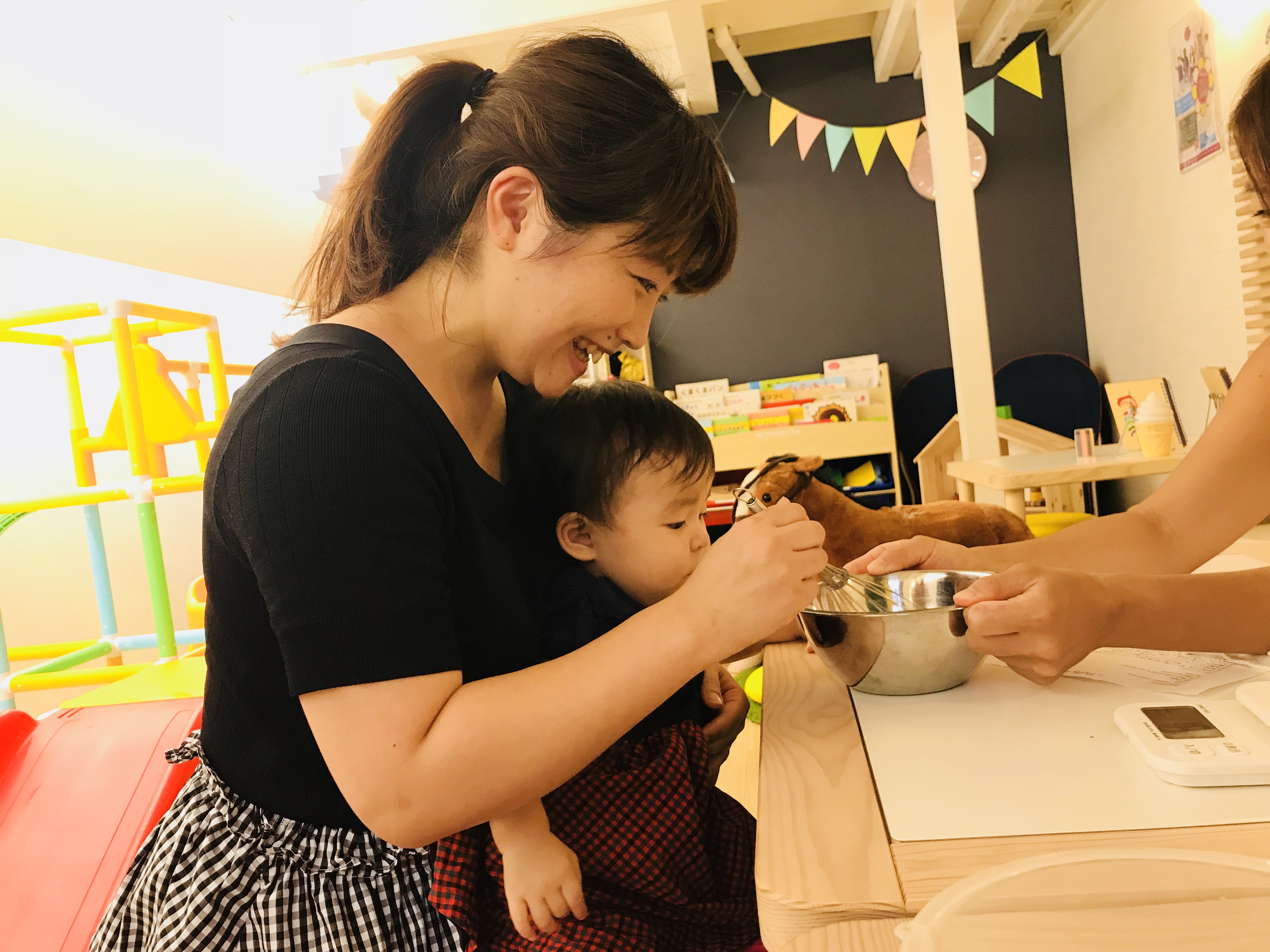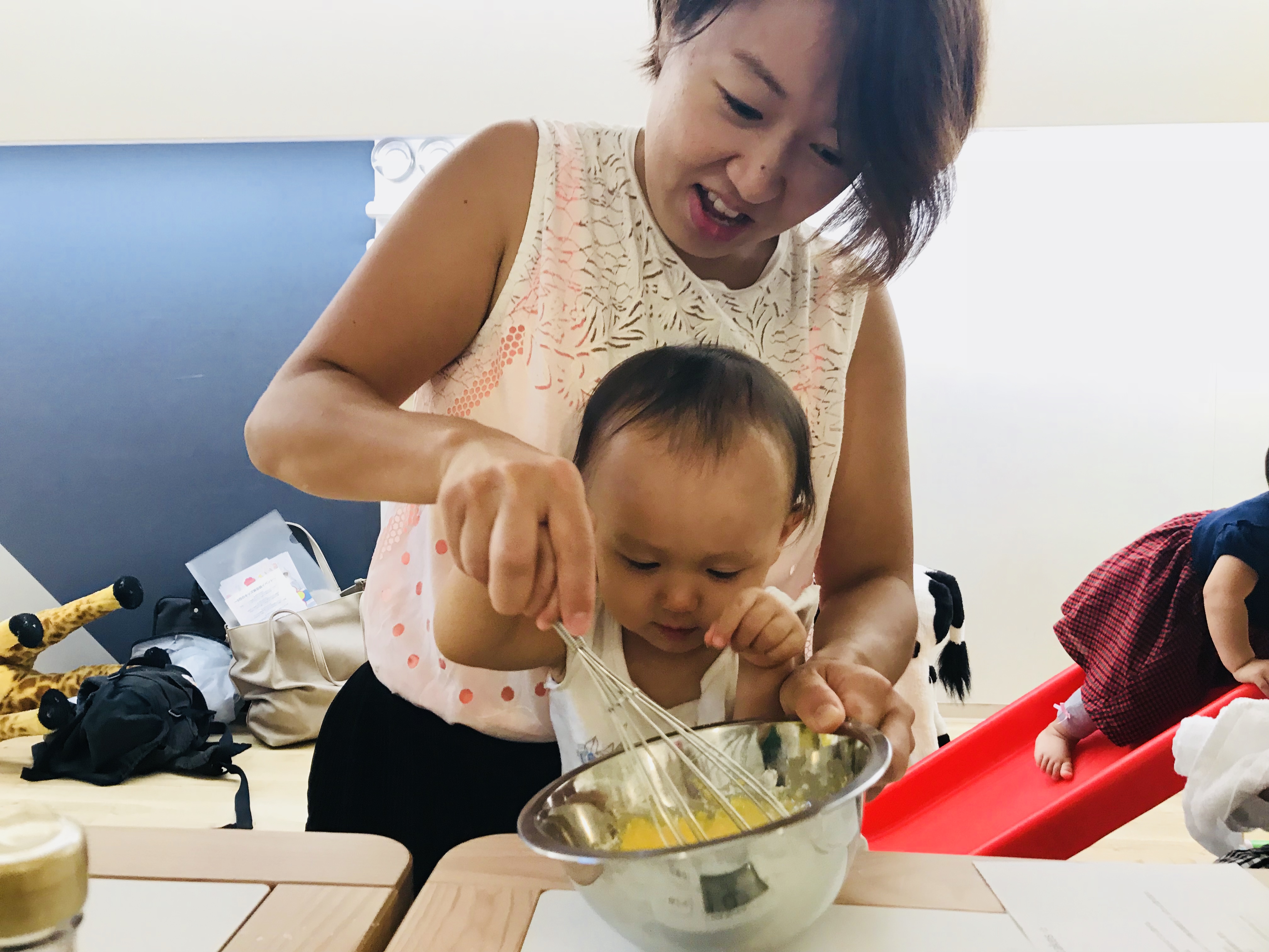 今回の参加者は、1歳児のお子さん3名で小さかったので、ママと一緒に混ぜるお手伝いしました。