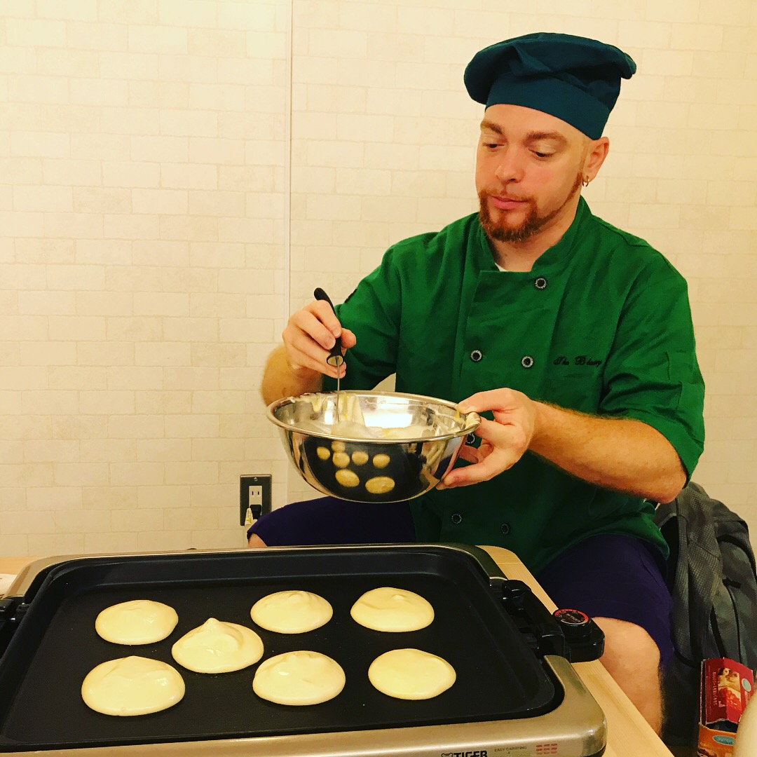パンケーキを作りながら、メレンゲの作るコツ、強力粉と薄力粉の使い分け、佐藤の種類の違いなど、クッキングの基礎も教えてもらいました。